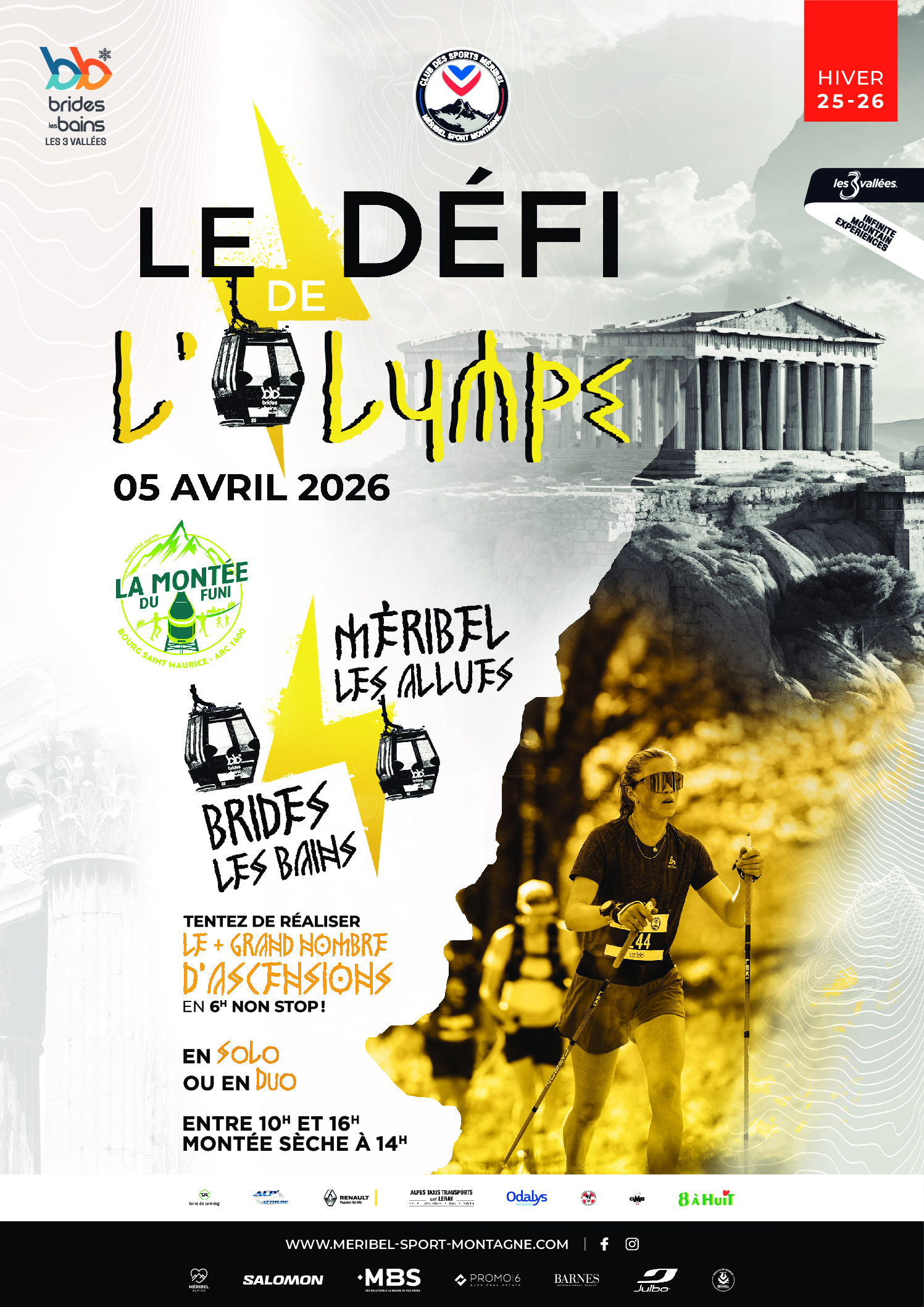 En préambule de la saison de trail, avant de ranger les skis et les masques, Méribel Sport Montagne vous propose le « défi de l’Olympe ». Une épreuve ludique à destination des rois de la grimpe. Un défi de 06h00 sur une montée sèche et chronométrée dans les gorges au départ de la station de Brides-les-Bains jusqu’au centre des Allues-Méribel.